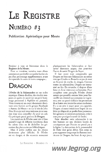 Le Registre est une série de publications officielles pour Meute, à destination des meneurs de jeu, et à la périodicité irrégulière. Ce troisième numéro (5 pages) continue la campagne entamée dans le premier numéro et commence sur Dragon (1 page et 1/2), une créature que peut seul libérer l’Ordre de la Salamandre (voir l’aide de jeu éponyme).