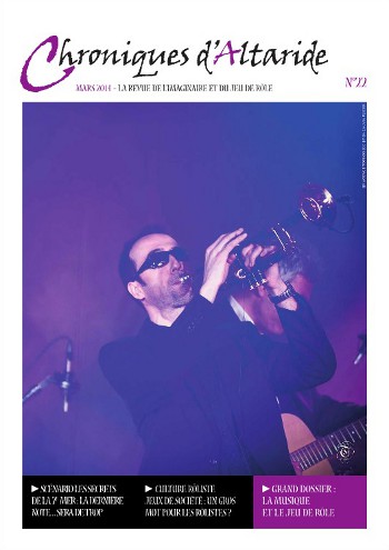 La musique fait battre le cœur de ce numéro 22 des Chroniques d'Altaride. Pour ce mois de mars 2014, il fallait donner le la. La revue sonne comme 96 pages de jeux de rôle et de cultures de l'imaginaire... et en rythme ! Au programme, un concert d'aides de jeu, des nouvelles, un scénario pour Les Secrets de la 7e mer, des réflexions ludiques, un peu d'actu, du papotage avec des gens pleins d'idées... et encore des bandes dessinées ! Le tout, on l'espère, sans fausse note.