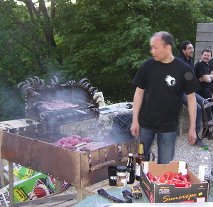 Le barbecue du dernier soir est toujours américain, mené de main de maître par Charlie Krank. Un amateur du GRoG veut m'offrir à boire mais Charlie offre une tournée générale. Ce sera donc pour une autre fois. Alias bosse toujours son œuvre littéraire, avant de filer faire la queue au bbq. Le wifi, notre seul lien avec le monde moderne dans cette terre perdue, oubliée de Dieu et des hommes, est tombé. Ça sent l'agonie de la convention. Les orga sont fatigués mais heureux, en dépit des quelques accidents qui ont fait heureusement plus de peur que de mal. Je suis crevé et je vais me coucher tôt.