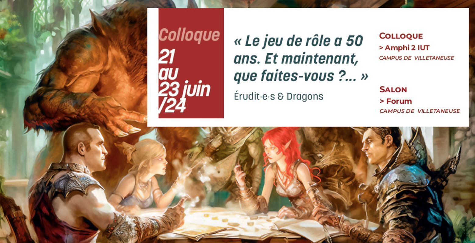 Les 50 ans de D&D, et par voie de conséquence du jeu de rôle, sont l'occasion de remises en perspectives et de réflexions diverses sur notre loisir. Un premier cycle, plutôt tourné vers l'histoire du JdR, s'est tenu en mars à l'université de Metz (Vous êtes dans une taverne...). Un deuxième cycle (Le jeu de rôle à 50 ans. Et maintenant que faites vous ?) a été proposé sur le week-end de fin du printemps à l'université Sorbonne Paris-Nord à Villetaneuse, en attendant une dernière danse à l'automne, avec le festival D'Roles de Jeux à Senlis.