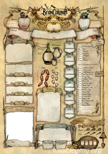 Les 10 fiches de personnage, vierges, présentent le modèle standard des fiches de personnage de Brancalonia. Il ajoute, par rapport à des fiches d'autres adaptations de D&D5, des champs en rapport avec la Rixe (Fatigue, Gnons, Prises), les Méfaits et Primes pour capture.