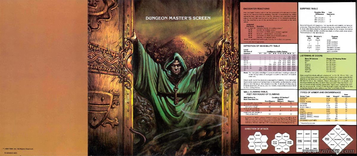 L'écran comporte sur la troisième face les tables de combat pour chaque classe de personnage, sur la quatrième, les différentes tables de jets de sauvegarde pour les créatures et les personnages, sur la cinquième, différentes tables sur les objets magiques, les armures et les armes, et, enfin, sur la sixième, les tables de rencontres, de détection de l’invisibilité, d’escalade, de surprise, d’écoute aux portes et d’encombrement.