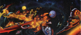 Cet écran à trois volets pour SpellJammer rassemble toutes les tables nécessaires à la gestion des parties, y compris les informations spécifiques à cet univers comme les caractéristiques des vaisseaux spatiaux. Côté joueur, il représente une scène de bataille spatiale.