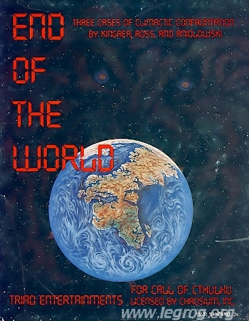 Il s’agit d’un recueil de scénarios dont le thème est la fin du monde (imagée), provoquée par un Grand Ancien. A charge des personnages d’empêcher cette situation cataclysmique. L’ouvrage commence les crédits, suivis de la table des matières (une page chacun, mais hors pagination).