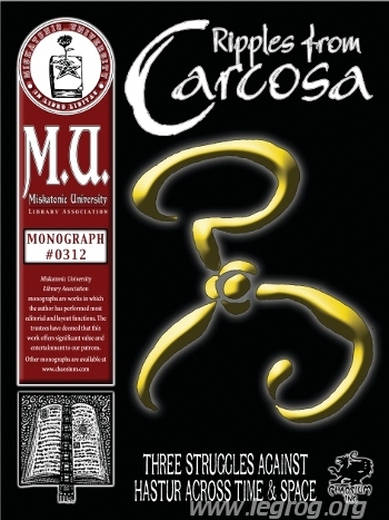 Ripples from Carcosa est un ensemble de scénarios tournant autour du Roi en Jaune créé par Robert Chambers, émissaire du mystérieux royaume de Carcosa cherchant à envahir notre réalité. La monographie s'ouvre sur les titre, crédits et sommaire avant un avant-propos qui présente l'approche choisie par l'auteur et le contenu qui suit, réparti en un récapitulatif d'informations sur Hastur, Carcosa et le Roi en Jaune, trois scénarios (chacun incluant six fiches de prétirés) se déroulant environ à 1000 ans d'intervalle en utilisant les suppléments Cthulhu Invictus, Cthulhu Dark Ages et End Times, et de courts chapitres apportant des précisions sur les époques où se déroulent ceux-ci (5 pages pour le tout).