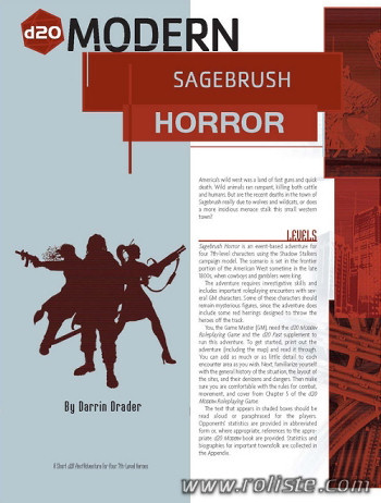 Sagebrush Horror est une aventure destinée à un groupe de quatre personnage de niveau 7 et conçue pour être intégrée à la campagne Shadow Stalkers décrite dans le supplément d20 Past. Elle a pour cadre l'Ouest sauvage américain à la fin du XIX° siècle.