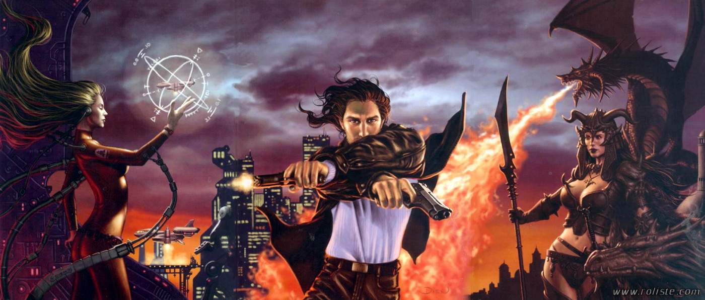 Côté joueurs, l'écran arbore les trois illustrations des livres de base Fantasy, Adventure et Space dans un ensemble qui fait lien dans le décor : une barbare, un flingueur et une métaphysicienne correspondent en effet aux trois périodes du jeu.