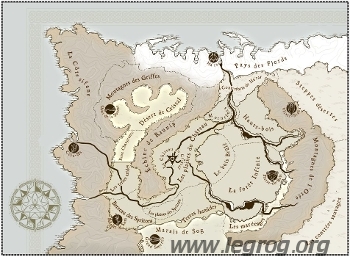 Thra World Map (Carte de Thra) contient, comme son nom l'indique, la carte du monde de Thra, avec indications des espaces géographiques (Désert de Cristal, Les Contrées Sauvages...), et lieux principaux (Le Château du Cristal, Pierre-du-Bois...).