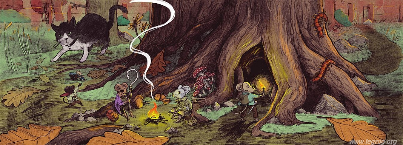 L'Écran (Screen en VO) pour Mausritter offre, côté joueurs, une illustration paysage d'une scène de vie de souris en voyage.