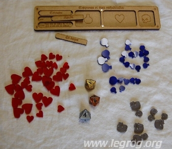 Les pions de vie, de mana et de convalescence prennent place dans les renfoncements de la plaquette des joueurs. Cette plaquette permet également d’indiquer les états préjudiciables (affaibli, contraint, en danger) que subit le personnage grâce à un système de cache. Le rappel de la règle de chaque état est gravé sous son cache.