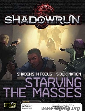 Shadowrun in Focus : Sioux Nation - Starving the Masses est le troisième opus de la série Shadows in Focus. Ce scénario propose cette fois-ci un run dans la Nation Sioux. Après une rapide Introduction et une présentation du Background (2 paqes pour les deux), le Synopsis du scénario est posé en une demie page.
