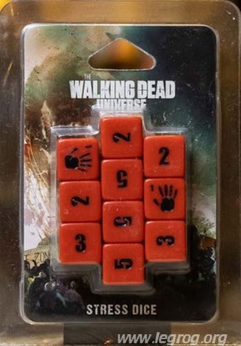 Pour simuler cet aspect, les règles prévoient l'insertion de dés spécifiques au milieu des dés normaux utilisés pour les jets. Ces dés de Stress ont des résultats défavorables s'ils donnent un résultat de 1. Pour faciliter la lecture des résultats, l'éditeur a produit des sets de dés dédiés. On a donc là une dizaine de dés rouges, les faces 1 et 6 étant ornées d'icônes spécifiques.